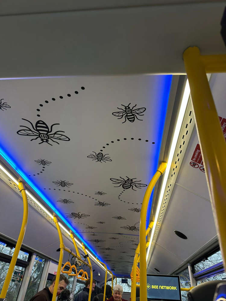 The interior of the bus is decorated with a pattern of Greater Manchester bees, to represent the other victims of the bombing.
