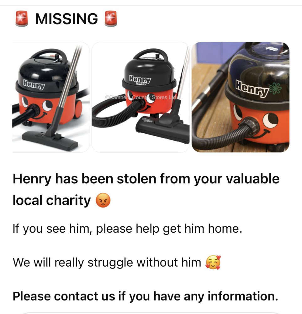 Anyone with information about the missing vacuum cleaner is asked to contact the charity directly.