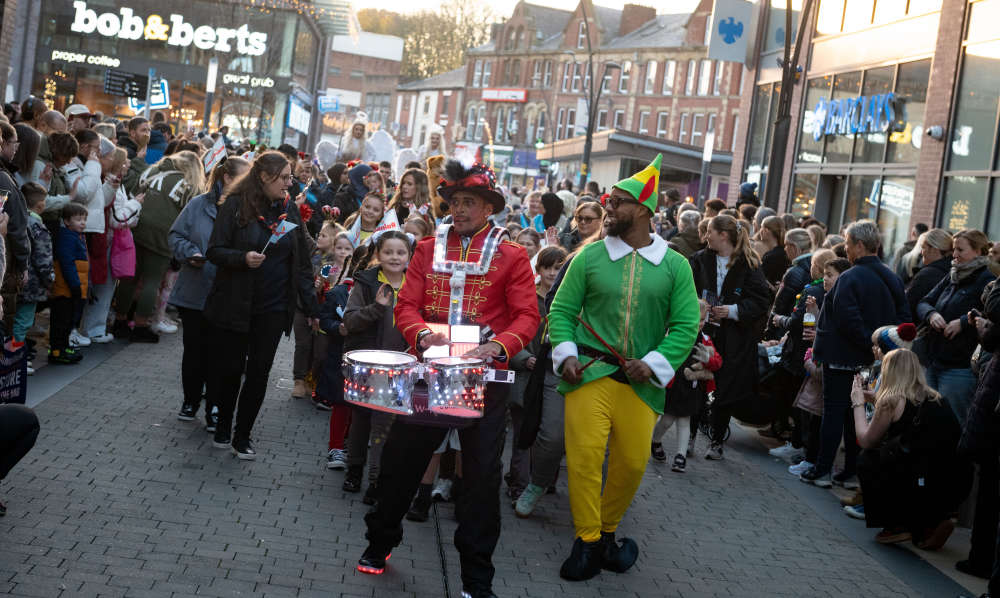 Parade performers included stilt-walking angels, a Christmas pudding, and roaming disco balls. Staff from Primark and Hotel Chocolat took part in festive costume, while a cheeky elf and an LED drummer led the event. Music and a live broadcast were provided by community station Roch Valley Radio.