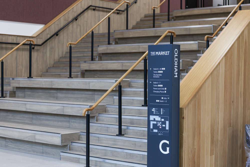 The trading area is mostly on the first floor of the new building, directly accessible from the Spindles shopping centre. This is connected to the ground floor via a grand staircase, which doubles as bleacher seating for diners and shoppers.