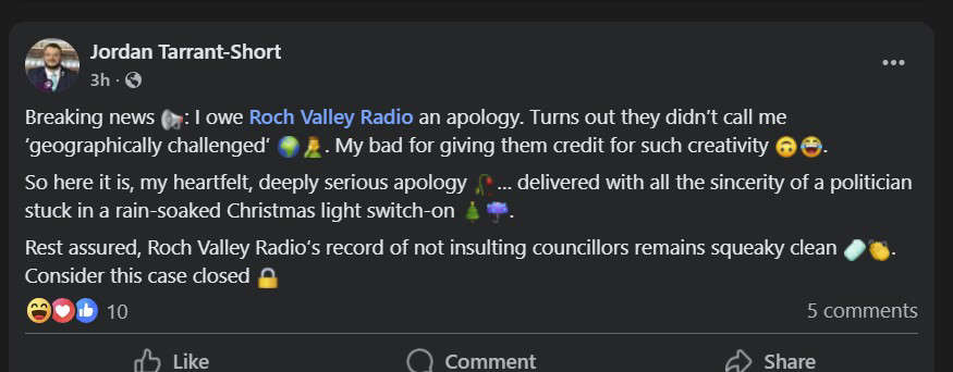 He described the post as a “heartfelt, deeply serious apology”, delivered with what he called the sincerity of a “politician stuck in a rain-soaked Christmas light switch-on”. He also acknowledged that Roch Valley Radio’s record of not insulting councillors “remains squeaky clean”.