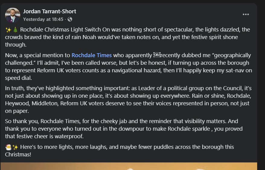 Jordan Tarrant-Short, who represents Balderstone and Kirkholt for Reform UK and leads the party’s group on Rochdale Council, had posted a public statement suggesting Roch Valley Radio had referred to him as “geographically challenged”. The phrase was used in the context of defending his appearances at events across Heywood, Middleton and Rochdale during the Christmas season.
