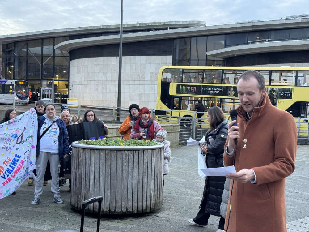 James Binks is pictured speaking at the White Ribbon event at Riverside. Credit: Rochdale Council