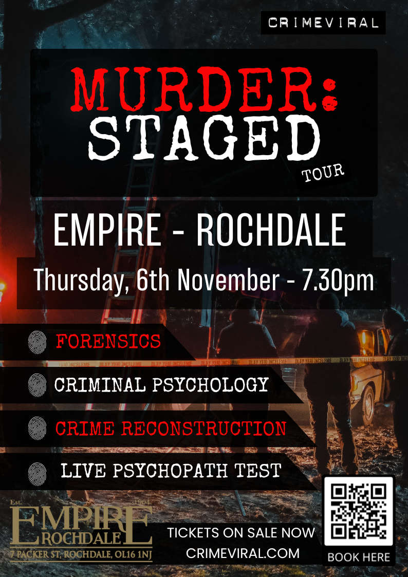 A new true crime event, Murder: Staged, will appear at the Empire Rochdale on Thursday 6 November 2025 at 7.30pm. The two-hour evening will be hosted by BBC-featured forensic psychology researcher and psychopathy expert Cheish Merryweather, who will guide audiences through real-life crime scenes, forensic reconstructions, and psychological tests.
