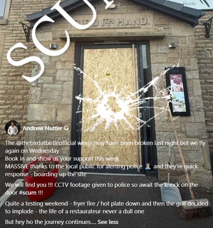 Chef Nutter, who previously ran the acclaimed Nutters Restaurant in Rochdale, took to social media to condemn the incident, branding those responsible as “scum”.