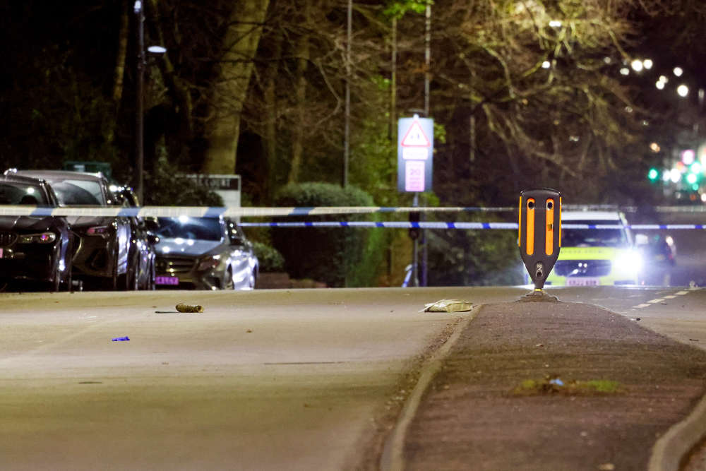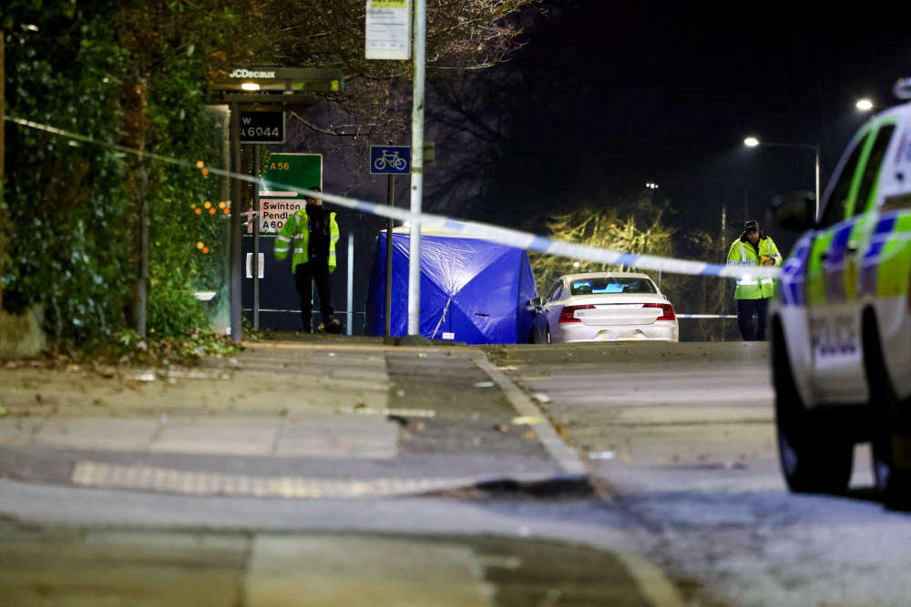 A shoe and handbag can be seen in the middle of Bury New Road inside the cordon on the opposite side of the carriageway as the forensics tent.